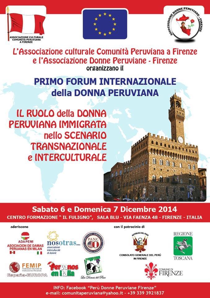 Il forum sul tema "Il ruolo della donna peruviana immigrata nello scenario transnazionale e interculturale", organizzato dall’Associazione culturale Comunità Peruviana a Firenze e dall’Associazione Donne Peruviane, si svolgerà a Firenze sabato 6 e domenica 7 dicembre 2014.