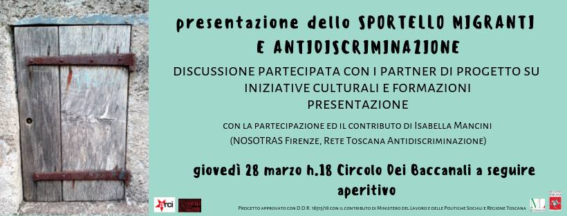Presentazione dello Sportello Migranti e Antidiscriminazione di Massa-Carrara presso il circolo Arci dei Baccanali in via San Piero 3 a Carrara. Giovedì 28 marzo 2019 dalle 18 alle 20.