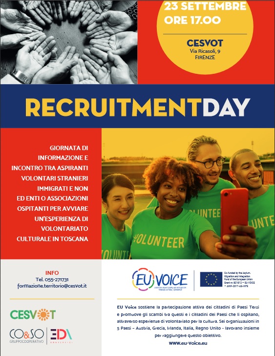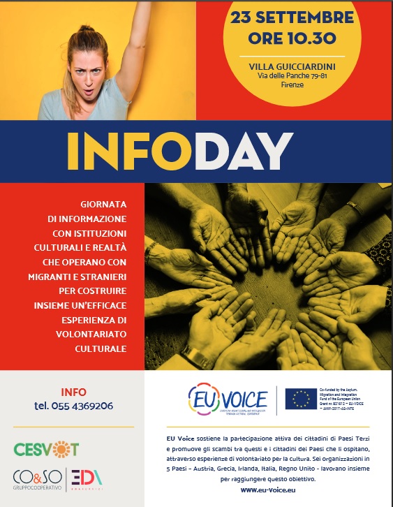 Prosegue il progetto europeo EU Voice che sostiene la partecipazione attiva dei cittadini di Paesi Terzi attraverso esperienze di volontariato per la cultura. Due appuntamenti informativi a Firenze il prossimo 23 settembre.