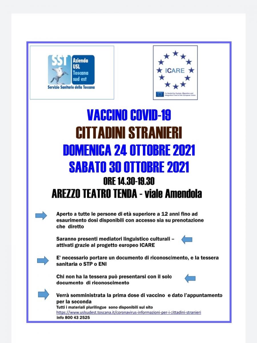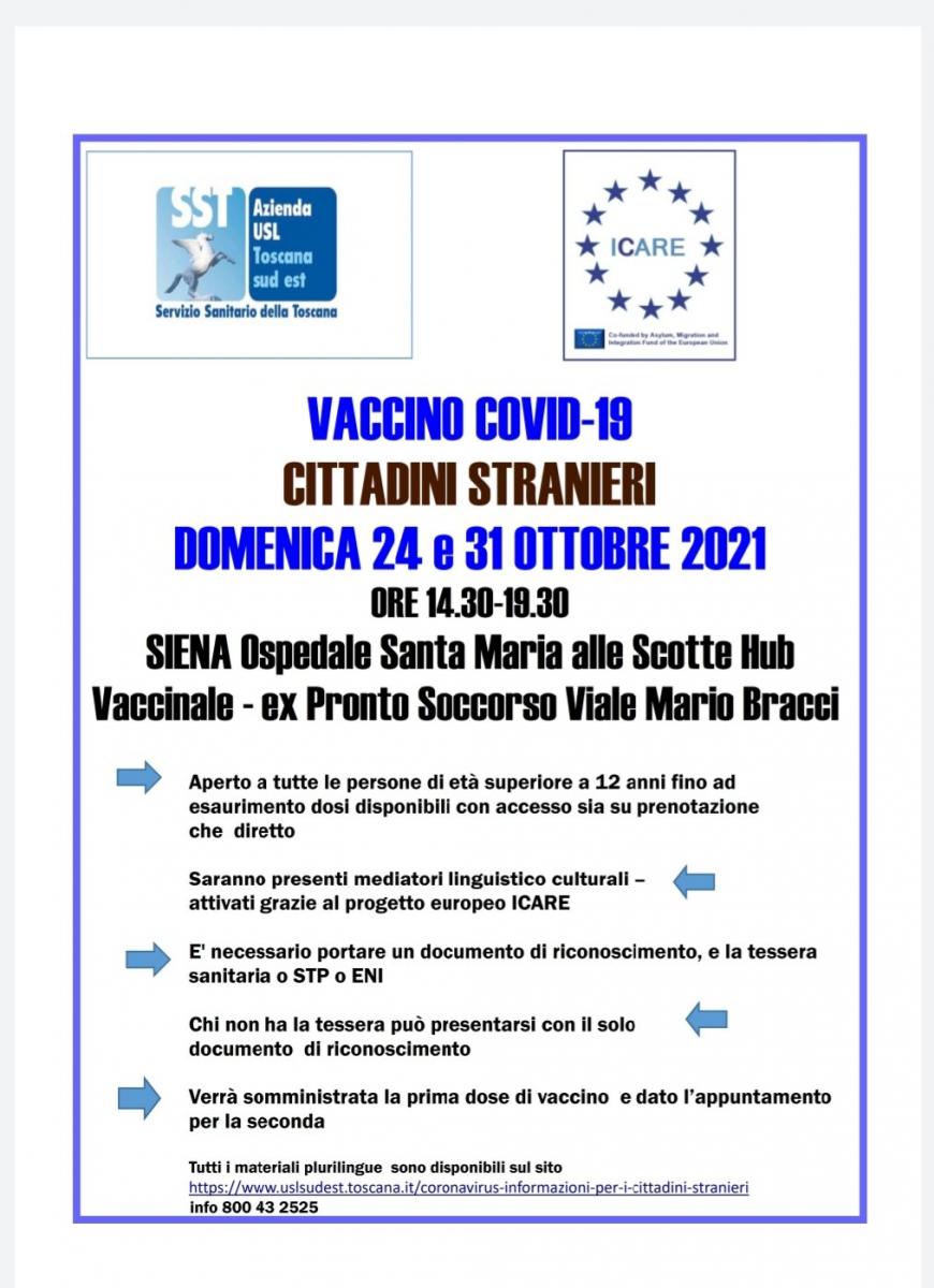 I nuovi appuntamenti per le vaccinazioni dedicate ai cittadini stranieri a Siena e Grosseto, domenica 24 e 31 ottobre 2021.