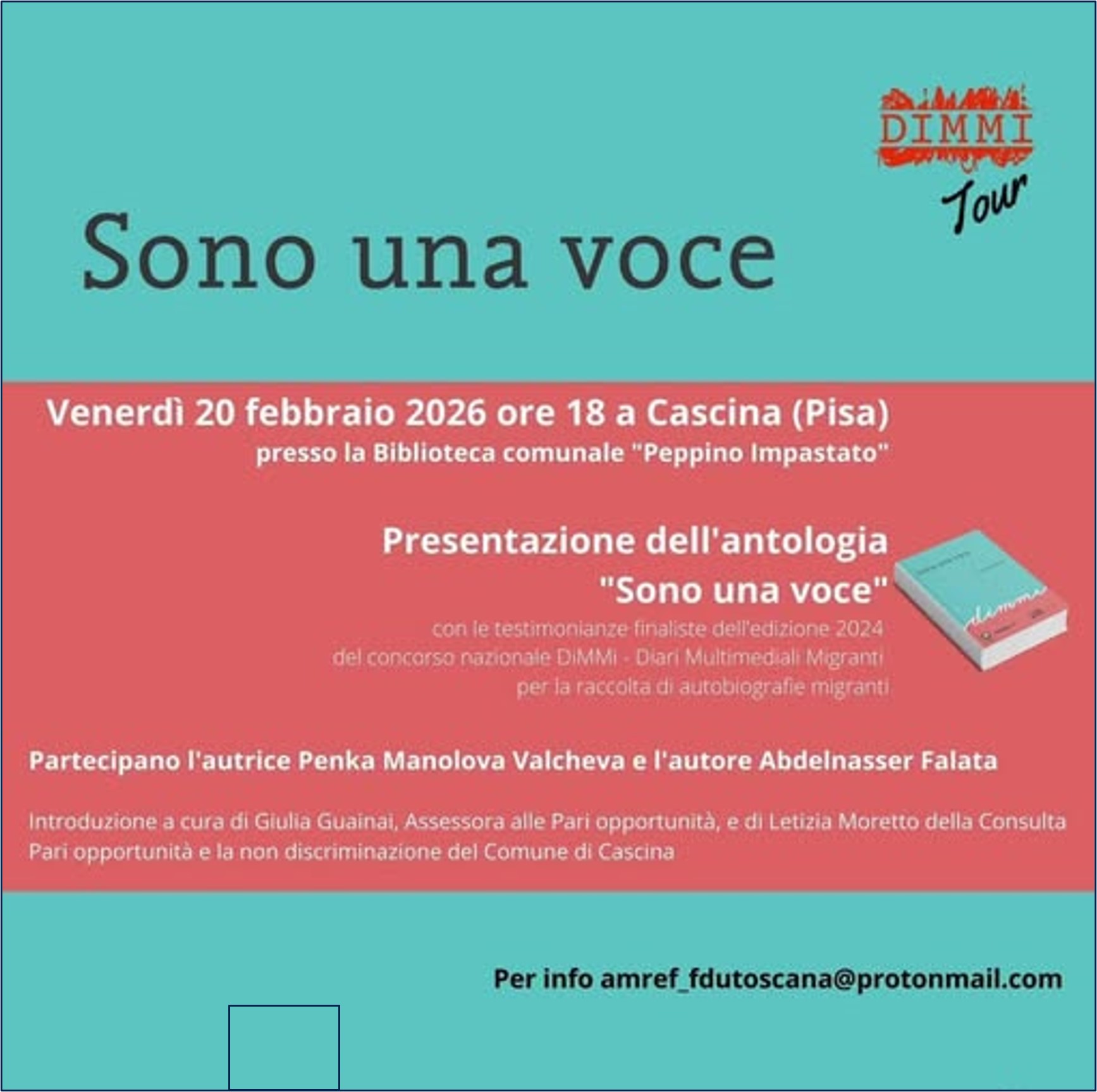 Presentazione dell’antologia “Sono una voce”, che raccoglie le testimonianze finaliste dell’edizione 2024 del concorso nazionale DiMMi. Venerdì 20 febbraio 2026 alle ore 18 a Cascina presso la Biblioteca Comunale.